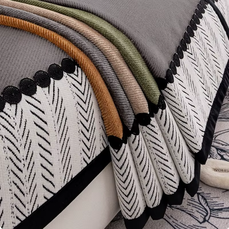 La conception met l’accent sur la tenue des fibres et la stabilité des bords : la bordure festonnée structure la pièce, limite les déformations et donne un cadre visuel élégant. Comme tout textile, la housse n’est pas indestructible : un grattage très appuyé et localisé peut finir par marquer. Son objectif est de protéger le revêtement d’origine, faciliter l’entretien courant et prolonger la vie du canapé.